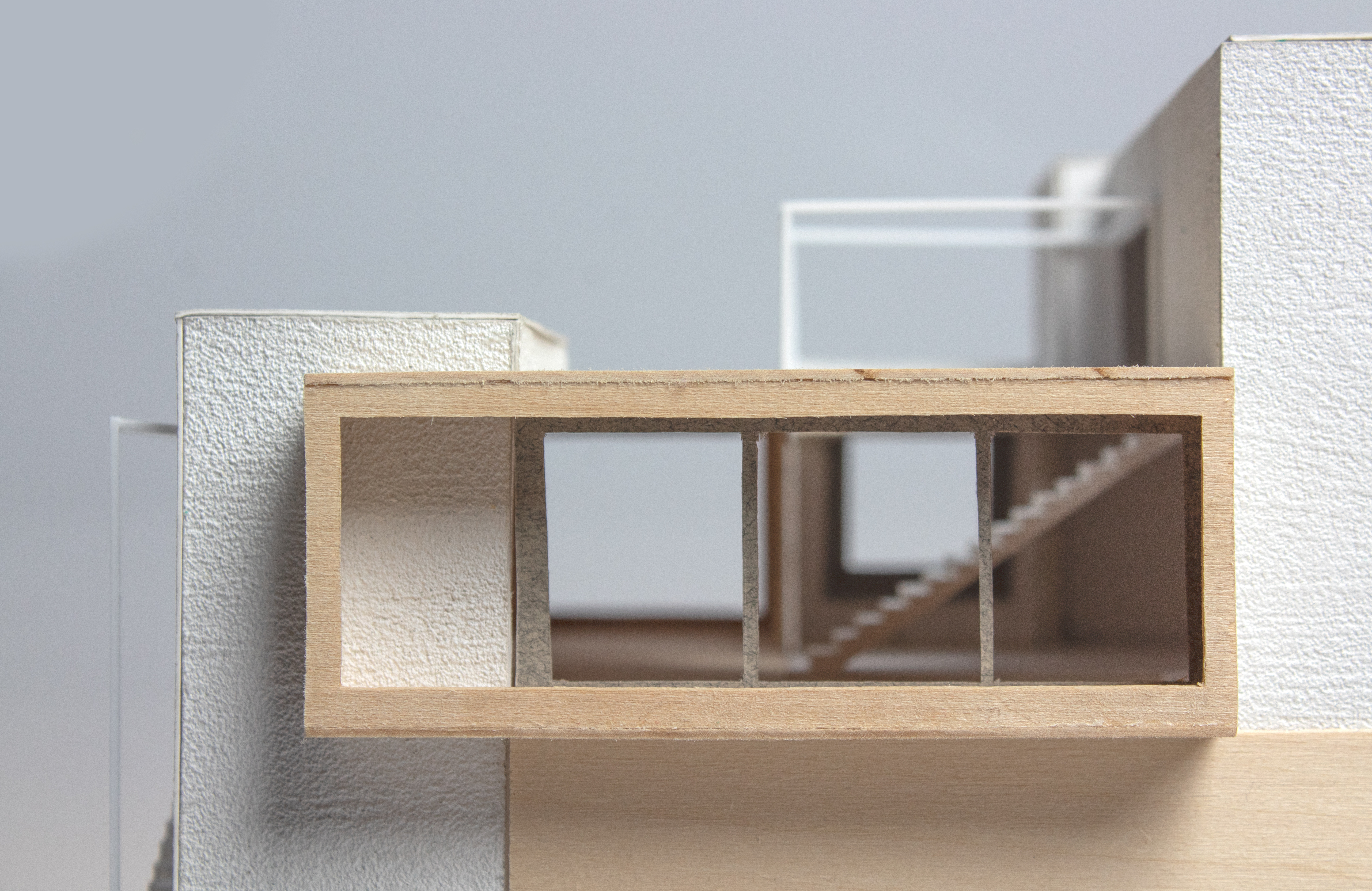 The building creates a space that emulates the impression of a sliding joint with forms that extrude and slip across each other. The dowels in the original joint are translated into inhabitable spaces and also create private areas in the duplex. The structure of the building allows for privacy but also connects interior with exterior spaces through the theme of revealing and extruding.